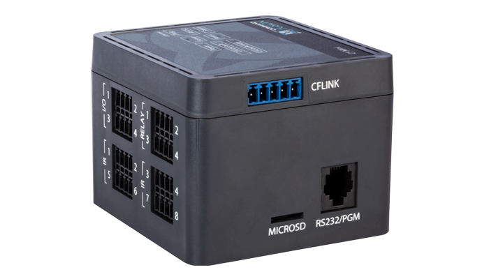 The CF Mini is a powerful, all-in-one controller. It features 8 x IR outputs, 4 x configurable I/O ports, 4 x 30VDC latching relays and one RS232/Program port.