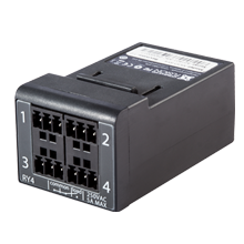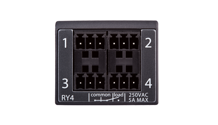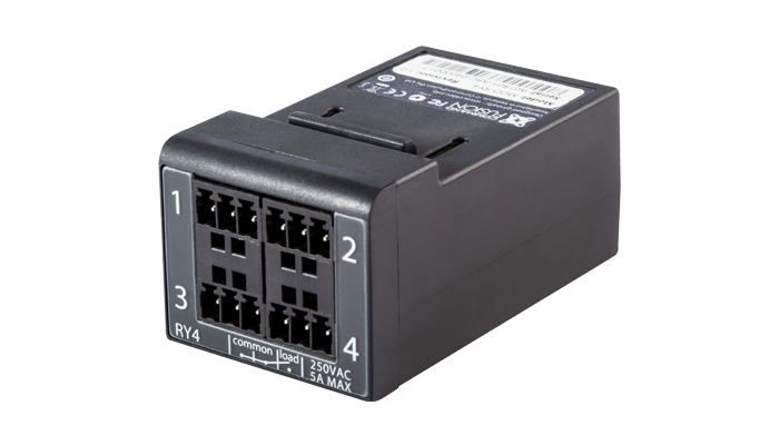 The RY4 module features 4 high voltage (250V AC, 5A) relay ports, and comes with detachable screw terminal blocks for secure connections to external relay-controlled devices. Plug it into a modular controller to add relay control ports to your system.