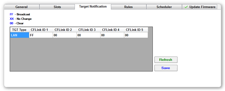 These notifications by default are broadcast to all devices on the CFLink bus via the CFLink target ID of FF (See Broadcast ID for more information)