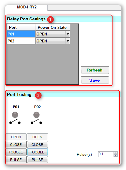 Open button will change the relay state to openClose button will change the relay state to closeToggle button will toggle the relay between open and closePulse button will pulse the relay for the amount of time set in the Pulse (s) box. The measurement is in seconds.