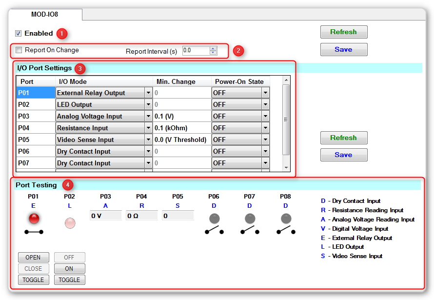 Click the Save button to save your changes to the module. Click the Refresh button to retrieve the settings from the module.