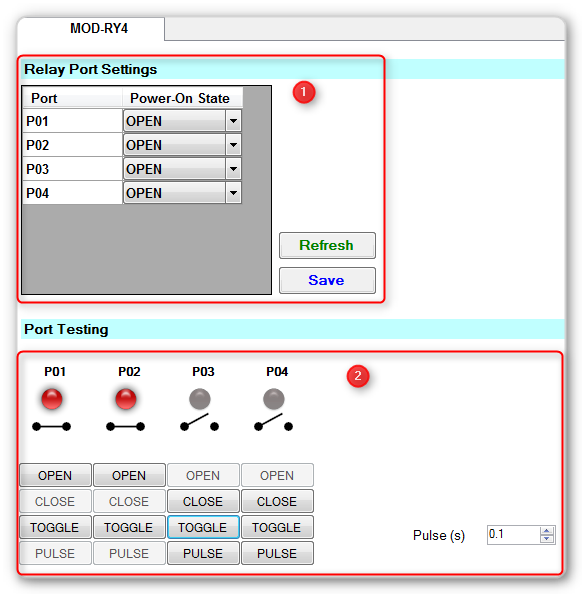 • Clicking the Pulse button will pulse the relay for the amount of time set in the Pulse (s) box. The measurement is in seconds.