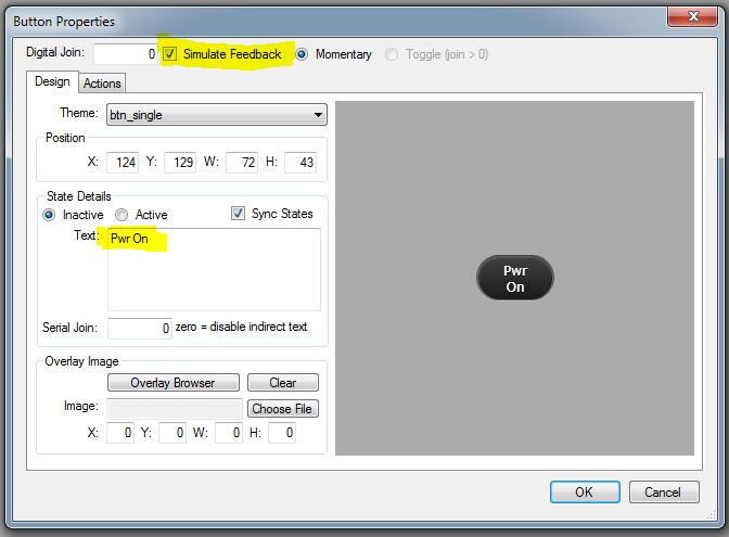 Double click on the top button to bring up the Button Properties Window, add the button text Pwr On in the text field and tick simulate feedback, this tells the button to go into a pressed state even when there is no feedback.
