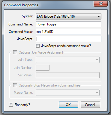 In the command properties box, type in the command name, and the command value - which is obtained from your hardwares documentation. The command value is the data that will be sent to the system. Do this for the rest of the commands required.