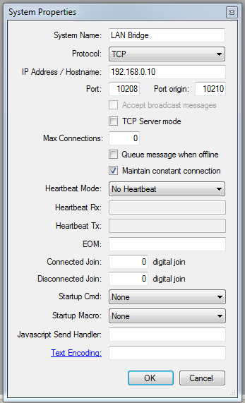 We need to add a system name (LAN Bridge), we will use the TCP protocol and the IP address of our LAN Bridge 192.168.0.10. The default port of the LAN Bridge to route data straight to the on-board RS232 port is 10208. Leave all other settings as default.
