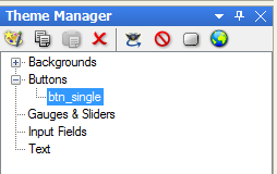 Now choose buttons in the theme library and scroll down to the button you want to use. We will be using btn_single for all the buttons in this project. The text shown in the preview window can be changed later on. Drag the button to the theme manager.
