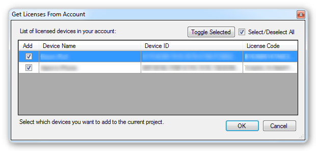 Once you successfully authenticate your account the Get Licenses From Account window will open listing all the licensed devices you have. From here you can select which devices you want to be able to use this GUI by ticking the Add checkbox and clicking OK
