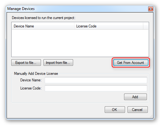 The recommended way to then add a device to your GUI is to link GUI designer to your account. To do this, in the Manage Devices window click Get From Account.