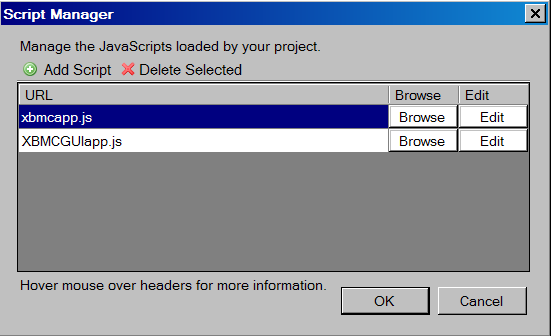 The Script Manager allows you to manage, add, delete, search and edit Javascript files that will be attached to the GUI. To access the Script Manager, just press the icon on the toolbar or by the drop down menu (Edit > Project Properties > Script Manager).