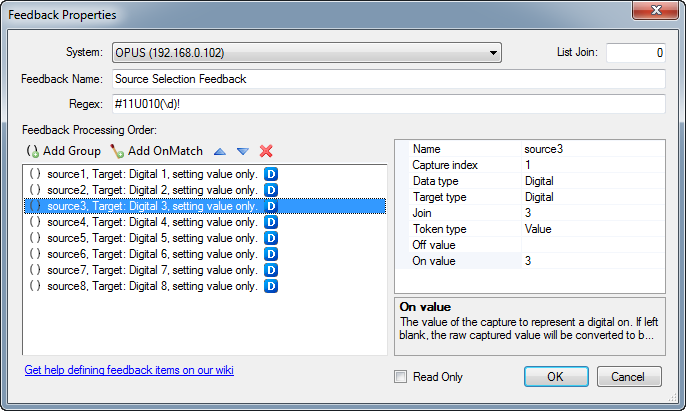 Also notice the 'On Value' is assigned the actual value that will be captured by the regex when we want to set the assigned digital join high (active button state). If this was left empty as well, then the assigned digital join is set to either low or high depending if the captured value results in a 0 or 1 by forcing the captured value to return a boolean (0 or 1) value.