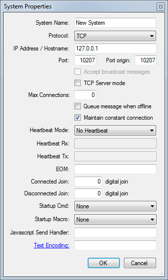 The system name must be a unique name in your project (no systems, commands, macros or feedback parsing can have the same name). When entering the name details, the OK button will be disabled if the name is already in use within the project.