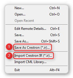 Click on File in the tool bar and select either 1. Save as Crestron or 2. Import Crestron IR.