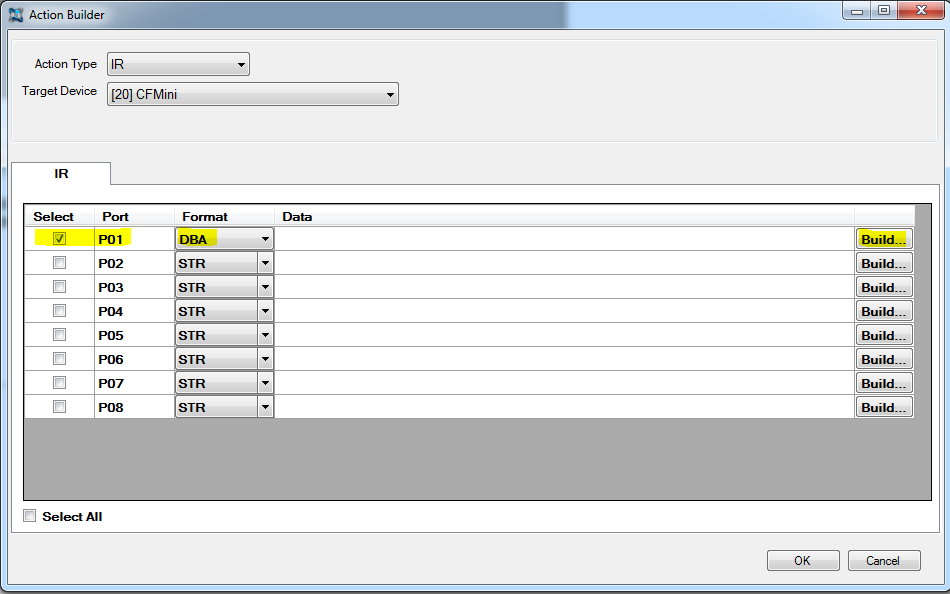 Select IR action type, choose the device we want to send the IR from - in our case IR port 1 of a CF Mini. Choose DBA format and press the ‘Build…’ button to bring up the IR database wizard.