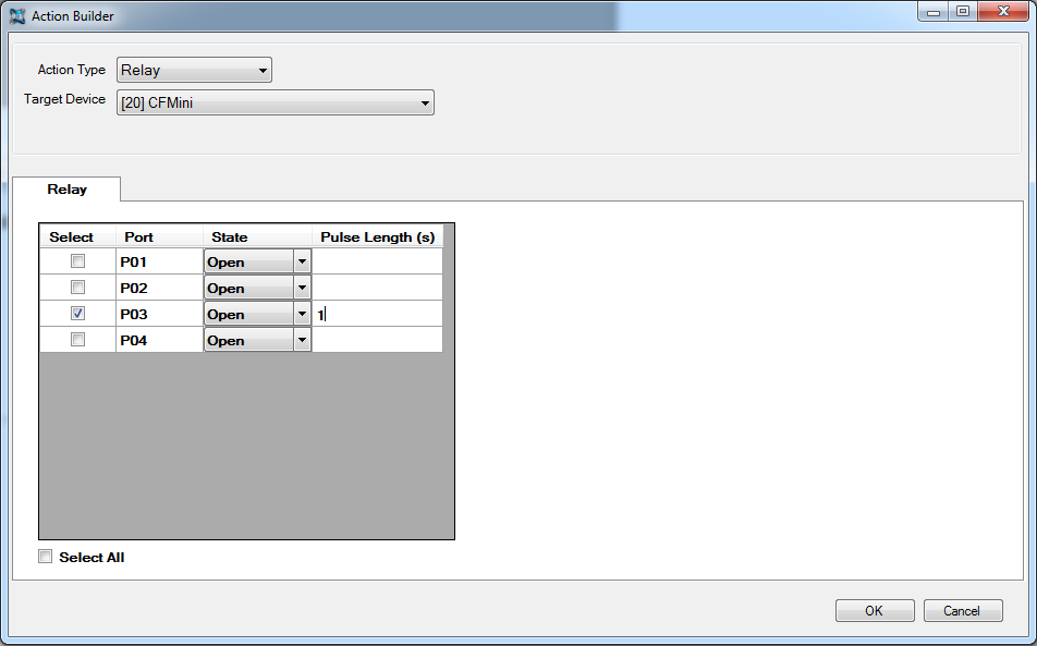 The relay ports will automatically populate based on the ports available on the target device. In our case we want to pulse relay 3 for 1 second.
