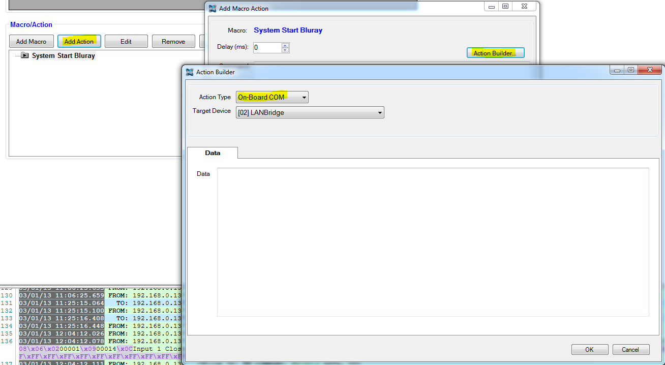 Now we need to add each action in order that we want them to be performed. First we want to turn on the projector because this can take a while to warm up. The projector is controlled via the on-board RS232 port of the LAN Bridge, click on Add Action and then click on Action Builder and select the action type On-Board COM.