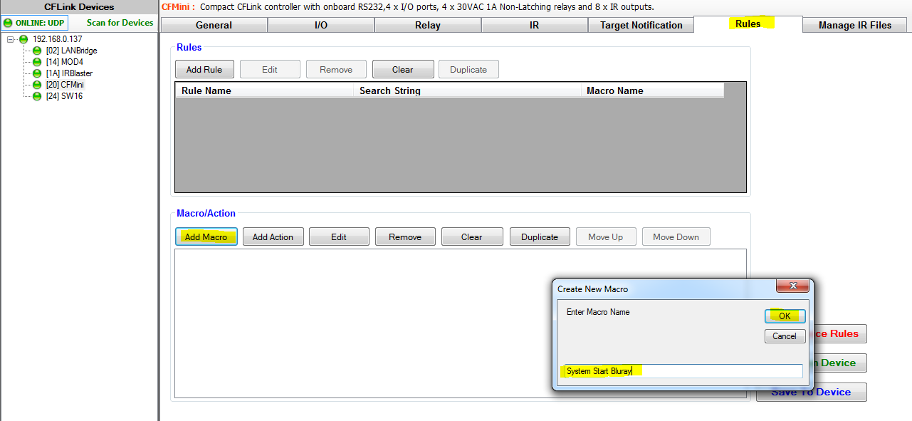 To create rules, we first setup the macros that will be triggered by adding them to the device that will receive the events. In this example we will be creating a macro to lower a projector screen, turn on a projector and turn on a bluray player.
