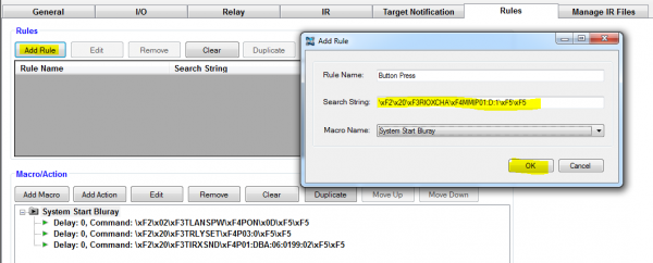 Now add the rule by pressing the Add Rule button. Give the rule a name relating to the input event and paste the command you just copied into the Search String Field. Then select the macro we want to fire and press OK.
