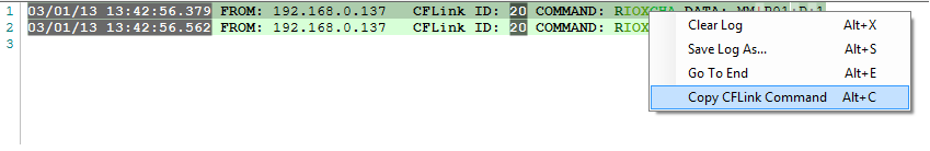 When the wall switch is pressed, we can use the communication log to see the incoming CFLink data format that we need to use to trigger our macro. To clear the log, right click on it and select Clear Log then find the command of the wall switch being pressed. Right click and copy the CFLink command.