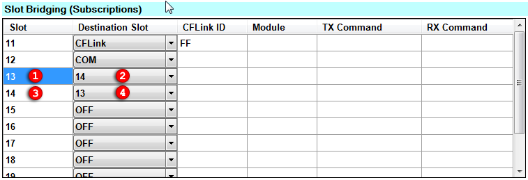 In the Slot Bridging grid, find the slot number for the two communication slots defined earlier. Then in the destination slot, choose the slot number for the corresponding communication slot.