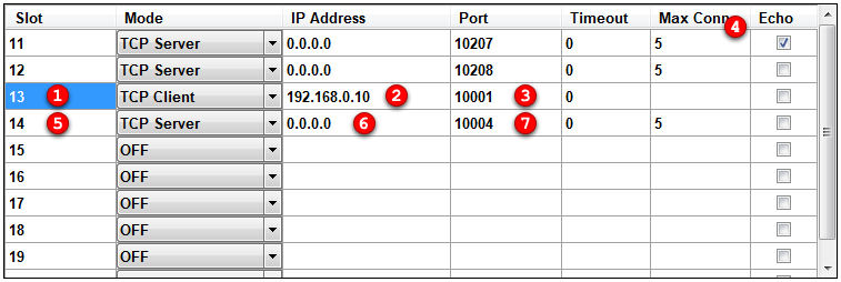 2. Data received on slot #13 will be bridged (forwarded) to slot #14 (any TCP Clients connected to the server, iPads, etc)
